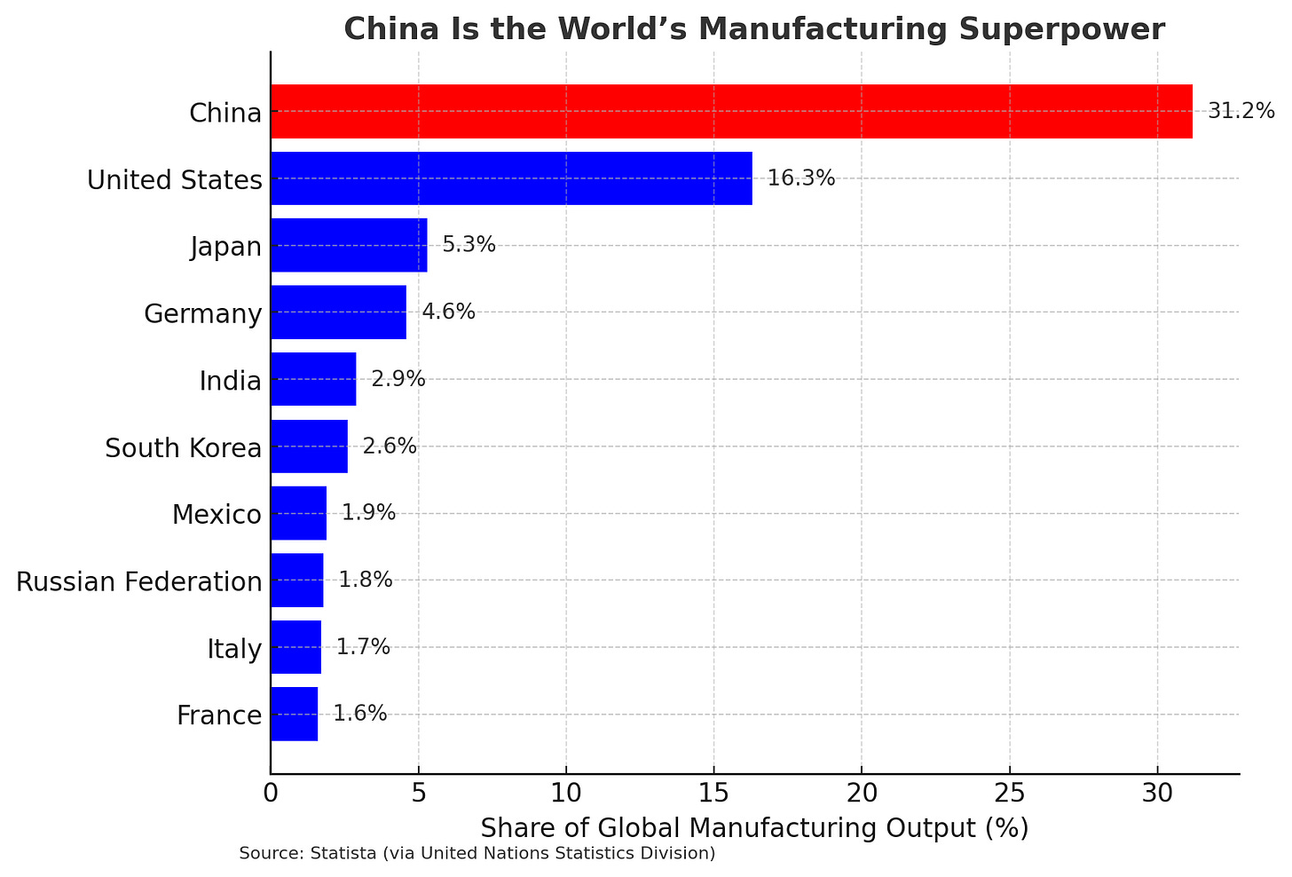 According to the United Nations Statistics Division, China produced 31% of the world’s manufacturing output in 2022—almost 15 percentage points ahead of the United States. With over $5 trillion in value added by its manufacturing sector, China contributed nearly 30% of its overall economic output. In fact, China’s manufacturing alone roughly equals the combined output of the next seven largest manufacturing nations!! This dominant position made China the world’s factory, drawing in billions of dollars in foreign investment and setting the stage for a global production model that many would later question.