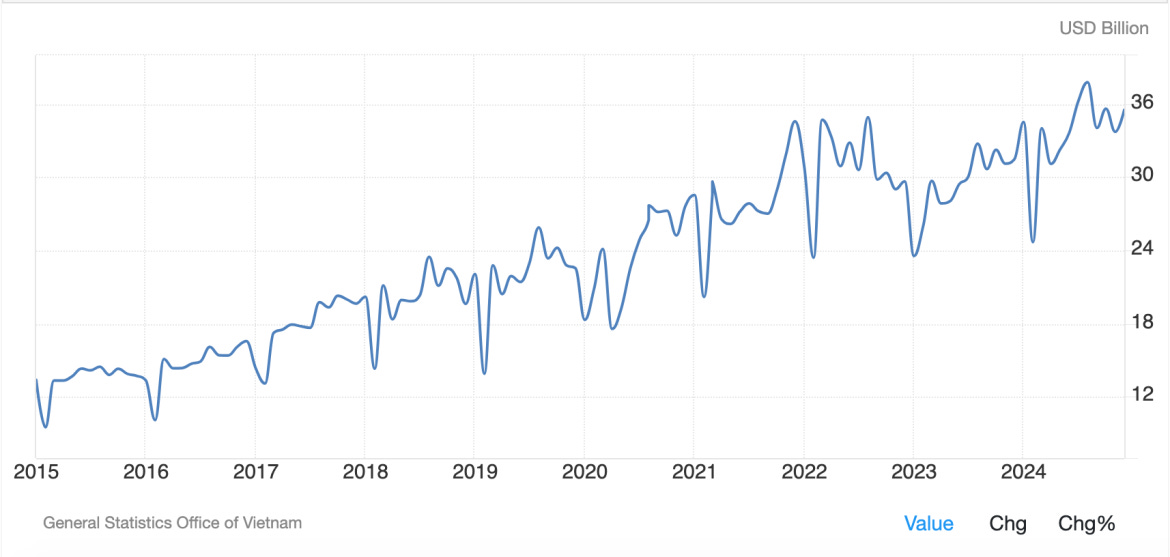 Vietnam: Exports jumped to $405.53 billion—a 14.3% increase.